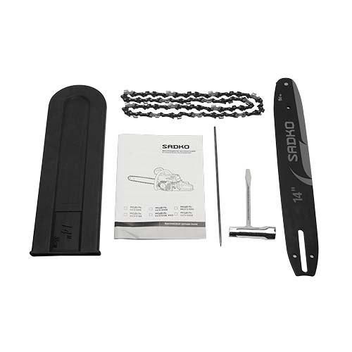 Шина, цепь, зубчатый упор, емкость для приготовления топливной смеси, свечной ключ, надфиль, а также комплект инструментов и монтажных изделий.