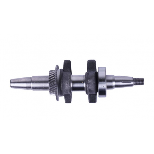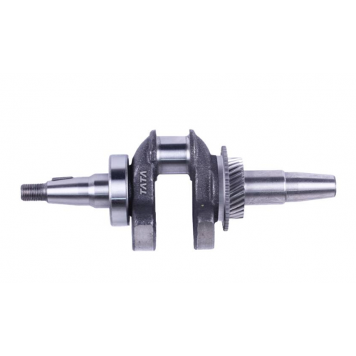 Коленвал в сборе под конус ТАТА на бензиновый двигатель 177F генератора GN 5-6 KW – неотъемлемая часть ДВС, входящего в состав электрогенератора средней мощности. Предназначен для преобразование тепловой энергии в механическую в процессе сжигания топлива в камере сгорания. Выход коленвала по конус позволяет без дополнительных переходников и потерь мощности соединить механический и электрический агрегаты электрогенератора. Деталь изготовлена из чугуна методом точного литья, что позволяет добиться высокой прочности в совокупности с точным соблюдением геометрических параметров. Коленвал в сборе комплектуется опорным подшипником и двумя шестернями, приводящими в движение распредвал и регулятор оборотов двигателя.