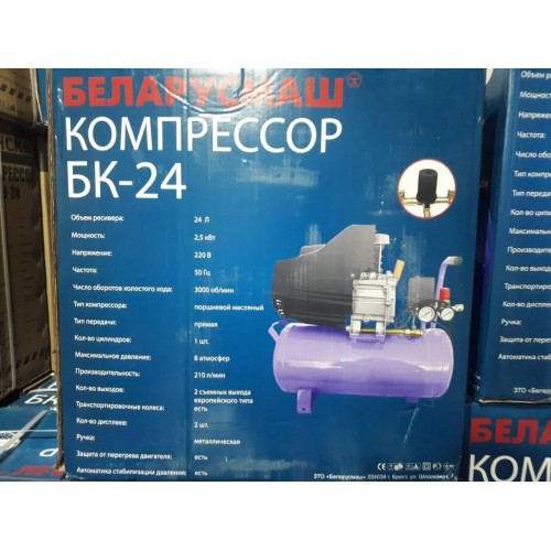 Компрессор Беларусмаш БК-24 ― масляный одноцилиндровый компрессор бытового класса, применяется для выполнения широкого спектра работ: покраски, продувки, подкачки колес, приведение в действие различных пневмоинструментов.