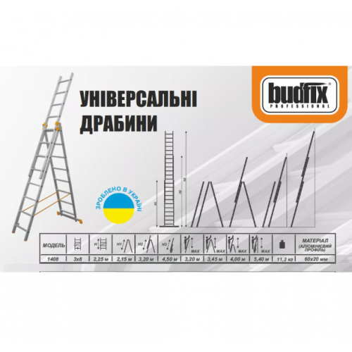 Универсальная трехсекционная стремянка Budfix 1408 (3х8) изготовлена из высокопрочного алюминиевого сплава. Алюминиевый профиль у лестницы Budfix – до 1,3 мм (у конкурентов до 1,25 мм). Рабочая площадка стремянки изготовлена из алюминия с антискользким рифлением (у конкурентов пластик).